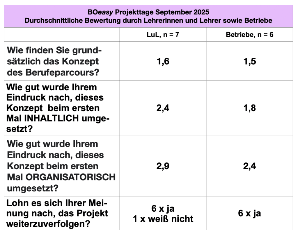 Bei den zweiten Projekttagen meinten 76 % der befragten Schülerinnen und Schüler, BOeasy ist gut oder sehr gut. Über 70% sagten, die Projekttage sollen wiederholt werden.