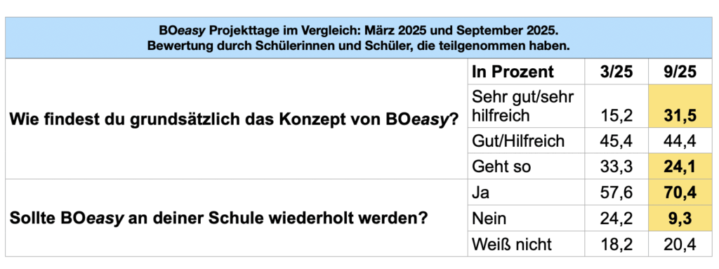 Durch mehr Praxis bei BOeasy hat sich der Anteil derjenigen, die sagen, “das Konzept von BOeasy ist sehr gut oder gut”, mehr als verdoppelt! Für eine Wiederholung an ihrer Schule stimmten jetzt 20 % mehr als beim ersten Mal.